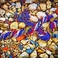 Afbeelding 9 van de serie "Schoonheid van verval": Een natte bundel kleurrijke draden ligt op een vloer van bouwpuin