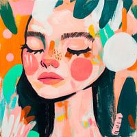 De foto toont een fascinerend portret van een vrouw met gesloten ogen, omgeven door levendige, abstracte kleuren. De lichte sproeten en rozige wangen zijn opvallend en geven haar een frisse, levendige uitdrukking. Het harmonieuze kleurcontrast en de speelse penseelstreken geven het werk een unieke, emotionele diepte.