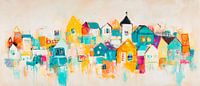In een zee van kleuren van helder geel, zacht blauw en vrolijk groen ontvouwen de speelse huizen zich als een stedelijk sprookje. De harmonieuze opstelling straalt een gevoel van gemeenschap en levendigheid uit. Dit kunstwerk past perfect in een uitnodigende woonkamer, waar het gesprekken stimuleert en een warme sfeer creëert.