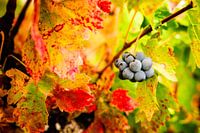 Bonte herfstbladeren van een druivenstruik. Druivenbladeren met rood, geel en groene kleuren en rijpe blauwe druiven om t eplukken. Nazomer in de wijngaard van de Provence in Frankrijk
