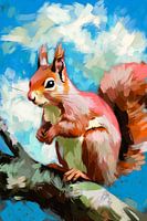 Dit levendige digitale schilderij toont een charmante eekhoorn die op een tak zit, tegen een helderblauwe achtergrond met wolken. De speelse kleuren en dynamische penseelstreken geven het werk een moderne uitstraling die perfect past in elke ruimte waar een vleugje natuur gewenst is. De warme tinten van de eekhoorn en de levendige…