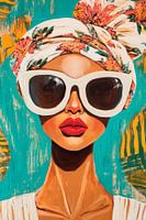 Een stralend portret van een modebewuste dame, wiens oversized zonnebril in het oog springt, wordt omlijst door een heldere, tropische achtergrond. De gebloemde hoofdtooi voegt een vleugje elegantie toe aan de afbeelding. Dit kunstwerk is ideaal voor in de woonkamer, spreekt de zintuigen aan en creëert een levendige sfeer.