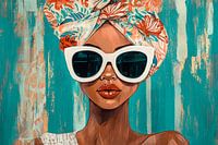 Een stralend portret vol levensvreugde en stijl! Met haar kleurrijke tulband en opvallende zonnebril straalt de sitter een ontspannen elegantie uit. De levendige kleuren van de achtergrond voegen een vleugje frisheid toe aan elke kamer. Dit kunstwerk is ideaal voor de woonkamer of creatieve ruimte en creëert een uitnodigende en inspirerende sfeer.