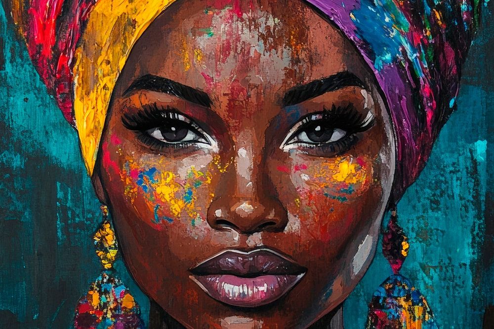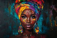 Een krachtig portret straalt levensvreugde en kracht uit met levendige kleuren en een indrukwekkende hoofddoek. De mix van diepe, stralende kleuren en de mysterieuze uitstraling van de persoon trekt ieders aandacht. Ideaal voor een woonkamer, het geeft de kamer een creatieve energie en zet aan tot nadenken.