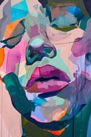 Het schilderij toont een fascinerend portret, bewerkt met levendige kleuren en krachtige penseelstreken. De meest indrukwekkende kenmerken zijn de gestileerde lippen, die oplichten in levendige tinten roze en perzik, en de ogen, die contrasteren in koele tinten blauw en groen. Over het geheel genomen straalt het werk een sterke emotionele diepte en creativiteit uit.