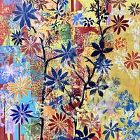 Levendige en kleurrijke compositie waarin een centraal geplaatste, sierlijke boomtak met bladeren en bloemen opvalt tegen een achtergrond van dynamische patronen en heldere kleuren. De achtergrond is opgebouwd uit een mix van vierkante en rechthoekige vlakken in diverse tinten geel, blauw, rood, en groen. Deze geometrische vormen geven een gevoel van beweging en diepte, waardoor de illusie van een textielachtig patroon ontstaat.