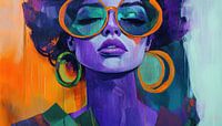Dit kleurrijke en moderne vrouw met oorbellen en zonnebril abstract panorama schilderij is een opvallend kunstwerk dat stijl en karakter toevoegt aan elke ruimte. De afbeelding toont een eigentijdse vrouw met grote oorbellen en een modieuze zonnebril, afgebeeld in een expressieve abstracte stijl die direct de aandacht trekt.