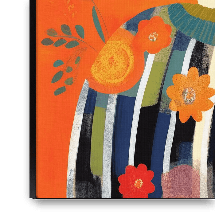 Kleurrijke en speelse illustratie in heldere kleuren, portret. Portret van een jonge vrouw met fleurige kleding en eoranje achtergrond met botanische elementen. Kies zelf het formaat en materiaal voor dit leuke en speels werk.