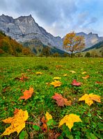 Kleurrijke esdoornbladeren in herfstkleuring in Ahornboden, Tirol, Oostenrijk
