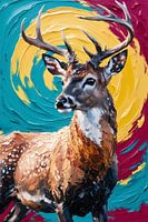Dit opvallende kunstwerk toont een majestueus hert met indrukwekkende hoorns, geschilderd in een expressieve stijl. Het schilderij combineert gedurfde penseelstreken met levendige kleuren zoals geel, turquoise en rood, waardoor het dier bijna uit het canvas lijkt te springen. De dynamische achtergrond, met wervelende abstracte vormen en felle tinten, voegt een gevoel van beweging en energie toe aan het werk. Deze moderne interpretatie van een hert past perfect in een eigentijds interieur, zoals een woonkamer of kantoorruimte, en kan een echte blikvanger zijn in elke ruimte. Het contrast tussen de realistische kenmerken van het hert en de abstracte omgeving creëert een fascinerende balans die de aandacht van elke kunstliefhebber trekt.