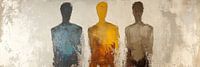 Kleurrijke figuren op een neutrale achtergrond - Op dit abstract schilderij zie je drie menselijke figuren in verschillende kleuren zoals blauw, geel en grijs, tegen een neutrale achtergrond, wat een moderne en eigentijdse uitstraling geeft.