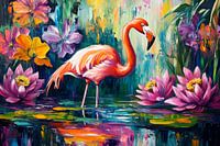 Te midden van een heldere regenboog van kleuren en vormen presenteert zich een majestueuze flamingo, waarvan het levendige roze contrasteert met de zachte leliebloesems. Kleurrijke bladeren omlijsten het tafereel, terwijl het water de schoonheid van de natuur weerspiegelt. Een harmonieus samenspel van elegantie en pracht geeft de foto…