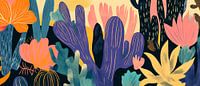 Een levendige zee van kleur van cactusachtige planten en prachtige bloemen ontvouwt zich tegen een donkere achtergrond die de intensiteit van de nuances versterkt. Deze bloemencompositie geeft elke kamer een frisse, uitnodigende sfeer en zou geweldig staan in de woonkamer of keuken om een levendige sfeer te creëren.