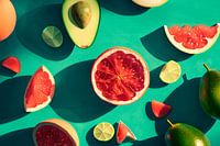 Er ontvouwt zich een harmonieus kleurenspel dat de groene tinten subtiel omlijst. Sappige grapefruit met helderrood vruchtvlees contrasteert speels met frisse limoen en romige avocado. Deze weelderige compositie brengt een vleugje zomer over en nodigt je uit om de smaken van de natuur te ontdekken. Een visueel feest dat de zintuigen streelt!
