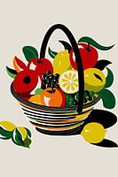 Dit kleurrijke kunstwerk toont een levendige fruitschaal vol met appels, citroenen, sinaasappels en druiven in een stijlvol ontwerp dat doet denken aan de Art Deco-periode. De heldere kleuren en strakke lijnen geven dit werk een moderne uitstraling, waardoor het een opvallende toevoeging is voor elk interieur. Perfect voor in de keuken…