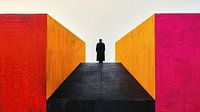 Dit abstracte kunstwerk toont een gang waarvan de muren doorkruist worden door kleurrijke, gestreepte kubussen. Aan het lichtgekleurde einde van de gang staat het silhouet van een man met zijn rug naar de kijker. De levendige kleuren van de kubussen creëren een dynamische en boeiende sfeer, terwijl het silhouet van de man een mysterieus…