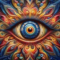 De afbeelding toont een artistiek ontworpen menselijk oog, omringd door symmetrische, vlam- of veerachtige patronen in felle kleuren. De iris ziet er hypnotiserend en surrealistisch uit, alsof hij in een andere dimensie kijkt. De compositie doet denken aan visioenen, bewustzijn en spiritueel ontwaken - een fascinerend samenspel van kleur, vorm en symboliek.