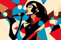 De passie van een zangeres ontvouwt zich in een levendig samenspel van felle kleuren en geometrische vormen. Haar lippen vormen een krachtige toon, terwijl de omhelzing van de microfoon de intensiteit van het moment benadrukt. De dynamische elementen om haar heen weerspiegelen het ritme van de muziek, dat de hele compositie doordringt…