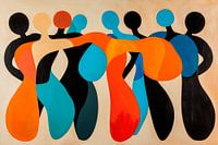 Levendige kleuren en vloeiende vormen komen samen in een dynamische compositie die gemeenschap en energie uitstraalt. De gestileerde figuren lijken op elkaar in te werken en creëren zo een gevoel van samenhang. Dit kunstwerk kan perfect in een woonkamer worden geplaatst om gesprekken te stimuleren en een levendige sfeer te creëren.