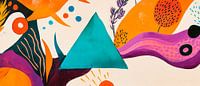 Een levendig samenspel van geometrische vormen en organische lijnen die de aandacht trekken met helder turquoise, warm oranje en diep paars. De dynamische structuren en speelse accenten geven elke ruimte energie. Perfect voor de woonkamer of een creatief thuiskantoor om inspiratie op te doen en een uitnodigende sfeer te creëren.