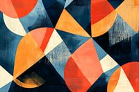Kleurrijke geometrie ontvouwt zich op een dynamisch canvas waar sterke, warme tinten harmonieus samengaan met diepe blauwtinten. Het samenspel van vormen brengt een levendige energie in de kamer en is perfect voor een moderne woonkamer. Hier wordt elk gesprek een belevenis en de sfeer nodigt uit om te blijven hangen.