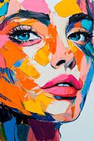 Het schilderij toont een krachtig, impressionistisch portret van een vrouw wier gezicht is geschilderd in sterke, levendige kleuren. De heldere, blauwe ogen en opvallende lippen staan in indrukwekkend contrast met de dynamische kleurspatten en symboliseren zowel expressiviteit als creativiteit. Deze artistieke compositie trekt de kijker…