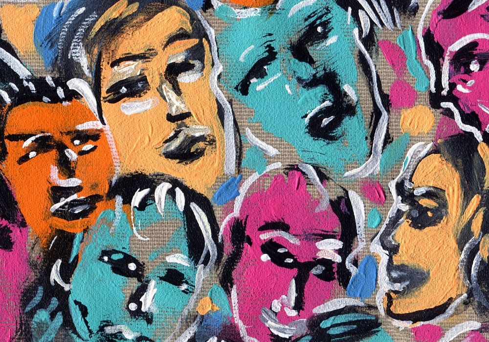 Een verzameling van kleurrijke gezichten van mensen door elkaar heen geschilderd op naturel linnen doek. Grafisch, kleurrijk patroon.