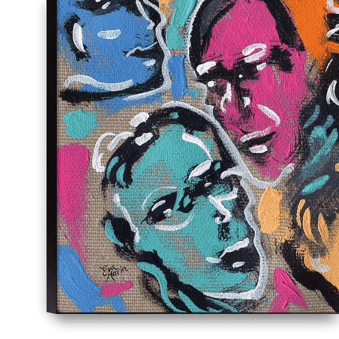 Een verzameling van kleurrijke gezichten van mensen door elkaar heen geschilderd op naturel linnen doek. Grafisch, kleurrijk patroon.