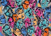 Een verzameling van kleurrijke gezichten van mensen door elkaar heen geschilderd op naturel linnen doek. Grafisch, kleurrijk patroon.
