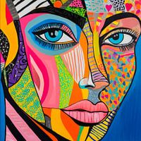 De foto toont een kleurrijk, gestileerd portret van een vrouw. Opvallend zijn de felle kleuren die in geometrische vormen zijn gerangschikt en de grote, expressieve blauwe ogen. De combinatie van delicate en gedurfde patronen geeft het kunstwerk een levendige dynamiek en trekt de kijker een fantasierijke wereld in.