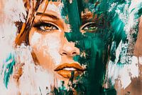 De stralende ogen en zachte gezichtsuitdrukking creëren een fascinerende band met de kijker. Het levendige, groen-turquoise kleurenschema brengt levendigheid en creativiteit in de kamer. Deze indrukwekkende afbeelding past perfect in een moderne woonkamer of een inspirerend kantoor, waar het gedachten stimuleert en sfeer creëert.