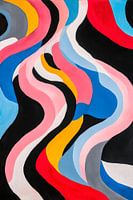 Een abstract spel van beweging en energie ontvouwt zich met vloeiende, levendige lijnen in krachtige kleuren. De harmonieuze combinatie van blauwe, rode, gele en zachtroze tinten voegt dynamiek en levendigheid toe aan de kamer. Perfect voor de woonkamer om een uitnodigende en creatieve sfeer te creëren.