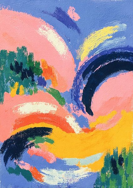 Dit levendige abstracte schilderij toont gebogen, golfachtige vormen in blauw, roze, oranje en geel tegen een achtergrond die verloopt van lichtblauw naar warme oranje en roze tinten. Dichte groene en subtiele roze penseelstreken in het onderste deel van het schilderij doen denken aan abstracte vegetatie en creëren contrasten. De…