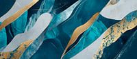 Een fascinerend samenspel van levendig turquoise en zachte gouden accenten die de dynamiek van water en de elegantie van de natuur weergeven. Deze vloeiende, organische vormen zijn zowel rustgevend als inspirerend. Ideaal voor de woonkamer, waar ze een sfeervolle oase van ontspanning kunnen creëren.