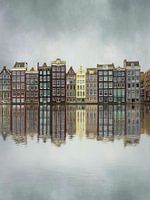 Een rij iconische Amsterdamse grachtenpanden weerspiegelt prachtig in het stille water, terwijl de wolkenlucht een kalme sfeer toevoegt. De mix van levendige kleuren en historische gevels vertelt het verhaal van een stad vol karakter en charme. Een tijdloos beeld dat zowel rust als stedelijke schoonheid uitstraalt.