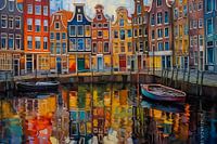 Met het gebruik van levendige kleuren en verfijnde details krijgt de stad een levendige uitstraling, en het spel met diepte en perspectief voegt een boeiende dimensie toe. Het schilderij biedt een schitterend beeld van het historische erfgoed van Amsterdam en nodigt de kijker uit om meegevoerd te worden door de bruisende energie van de stad.