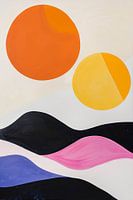 Dit indrukwekkende schilderij combineert felle kleuren en heldere vormen tot een harmonieus geheel. Twee grote cirkels in fel oranje en geel domineren de compositie en symboliseren zonneschijn en energie. De gebogen lijnen in zwart, roze en blauw voegen een dynamisch tintje toe en doen het landschap bijna surrealistisch lijken. Dit werk, geïnspireerd door moderne abstracte kunst, vangt de essentie van vreugde en creativiteit en nodigt de kijker uit om de levendigheid en het ritme van het leven te voelen.