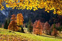 Kleurrijke bomen op een zonnige herfstdag in de Ammergauer Alpen bij Buching. Beieren, Duitsland