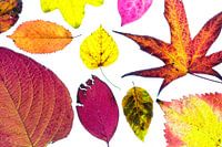 Collage van kleurrijke herfstbladeren op een witte achtergrond