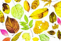 Collage van kleurrijke herfstbladeren op een witte achtergrond