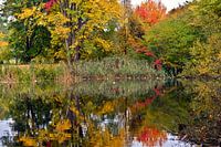 De reflectie van de loofbomen in roodachtige, gele en oranje…