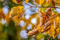 Close-up van herfstbladeren in intense geel- en bruintinten aan een tak. De bladeren vertonen al tekenen van verval, hoewel sommige nog duidelijk hun typische vorm vertonen. Op de voorgrond zie je kleine, lichtbruine vruchttrossen of knoppen aan dunne stengels hangen. Gefotografeerd door Photoart-Naegele in oktober 2025