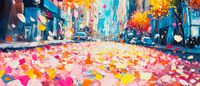 Een kleurrijk stadslandschap dat je bijna uitnodigt om te dromen. Glinsterende herfstbladeren dansen over het asfalt, terwijl heldere lichtreflecties de straten tot leven brengen. Deze harmonieuze combinatie van warmte en beweging creëert een uitnodigende sfeer in elke kamer. Perfect voor de woonkamer om een gezellige en inspirerende sfeer te creëren.