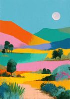 Dit schilderij toont een landschap met kleurrijke heuvels, bomen en struiken op de voorgrond. Een helderblauwe lucht wordt verlicht door een volle maan. De vlakke pastelkleuren - groen, geel, roze, oranje, turquoise, paars en blauw - benadrukken de minimalistische, naïeve vormentaal, geïnspireerd door Henri Matisse en kinderboekillustraties. Heldere, eenvoudige vormen en een laag detailniveau creëren een harmonieuze, heldere compositie. Zachte natuurlijke verlichting en zachte schaduwen geven de foto diepte, terwijl het brede perspectief een weids uitzicht over het kleurrijke landschap mogelijk maakt.