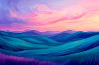 Zachte heuvels in zachte blauw- en paarstinten smelten samen met een dromerige lucht die gloeit in warme roze- en paarstinten. Dit harmonieuze landschap creëert een rustgevende sfeer en is perfect voor de slaapkamer, waar het je uitnodigt om te ontspannen en te dromen. Ideaal voor elke natuurliefhebber!