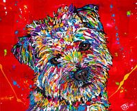 Boomer hond op een rode achtergrond van de kunstenaar Renate Rolefes.
