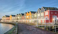 Foto genomen 's morgens in de ochtendzon aan de Rietplas in Houten. De gekleurde huizen geven een mooie reflectie in het water. Voor de huizen loopt een fiets- en voetpad.