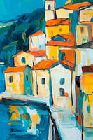 Heldere geeltinten smelten samen met stralend blauw om een harmonieuze kustscène te creëren die je uitnodigt om te dromen. Een rij charmante huizen met rode daken nestelt zich schilderachtig aan de rand van de kust, terwijl hun weerspiegelingen zachtjes dansen in het water. Deze levendige voorstelling roept een gevoel op van mediterrane…
