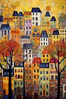 Dit werk toont een levendig tafereel van kleurrijke huizen, gerangschikt in een speelse compositie die onmiddellijk de aandacht trekt. De levendige kleuren, variërend van warme tinten rood en oranje tot koele blauwen en groenen, geven het geheel een dynamische uitstraling. De gestileerde vormen van de huizen stralen een charmante eenvoud uit, terwijl de compositie een gevoel van harmonie en gezelligheid oproept. Het werk nodigt uit tot ontdekken, alsof je door een zonnig, vrolijk dorpje wandelt. Perfect als blikvanger in een woonkamer of hal, brengt het een energieke en optimistische sfeer in de ruimte.