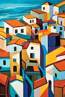 Een kleurrijk mozaïek van geometrische vormen ontvouwt zich, terwijl harmonieuze aardetinten helder blauw ontmoeten. De hellende, witte en crèmekleurige huizen lijken in zee te glinsteren, terwijl hun pannendaken warm licht weerkaatsen. Een levendige compositie die de levensvreugde van een kustdorp uitademt en de verbeelding prikkelt.